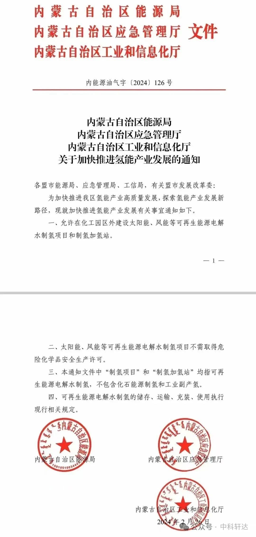 2024年2月26日,內(nèi)蒙古自治區(qū)能源局和內(nèi)蒙古自治區(qū)應急管理廳以及內(nèi)蒙古自治區(qū)工業(yè)和信息化廳聯(lián)合發(fā)布了重磅氫能源政策:《關(guān)于加快推進氫能產(chǎn)業(yè)發(fā)展的通知》(內(nèi)能源油氣字(2024)126號)。