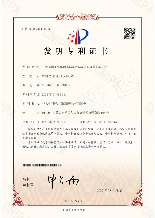 CN-21--0001-I-3374-一種適用于低壓固態(tài)儲氫的儲氫合金及其制備方法-發(fā)明專利證書(簽章)-ZL 2021 1 0030086.2